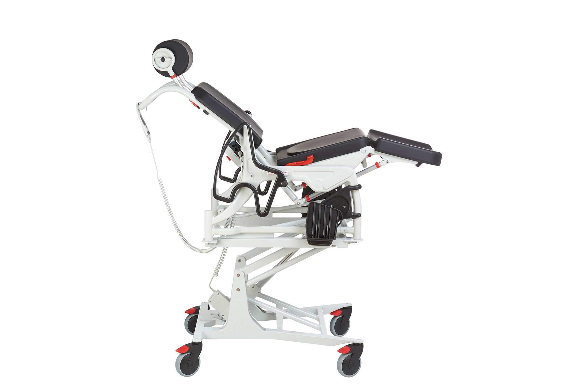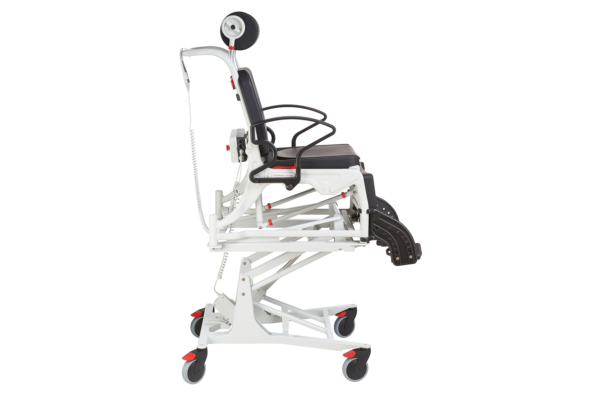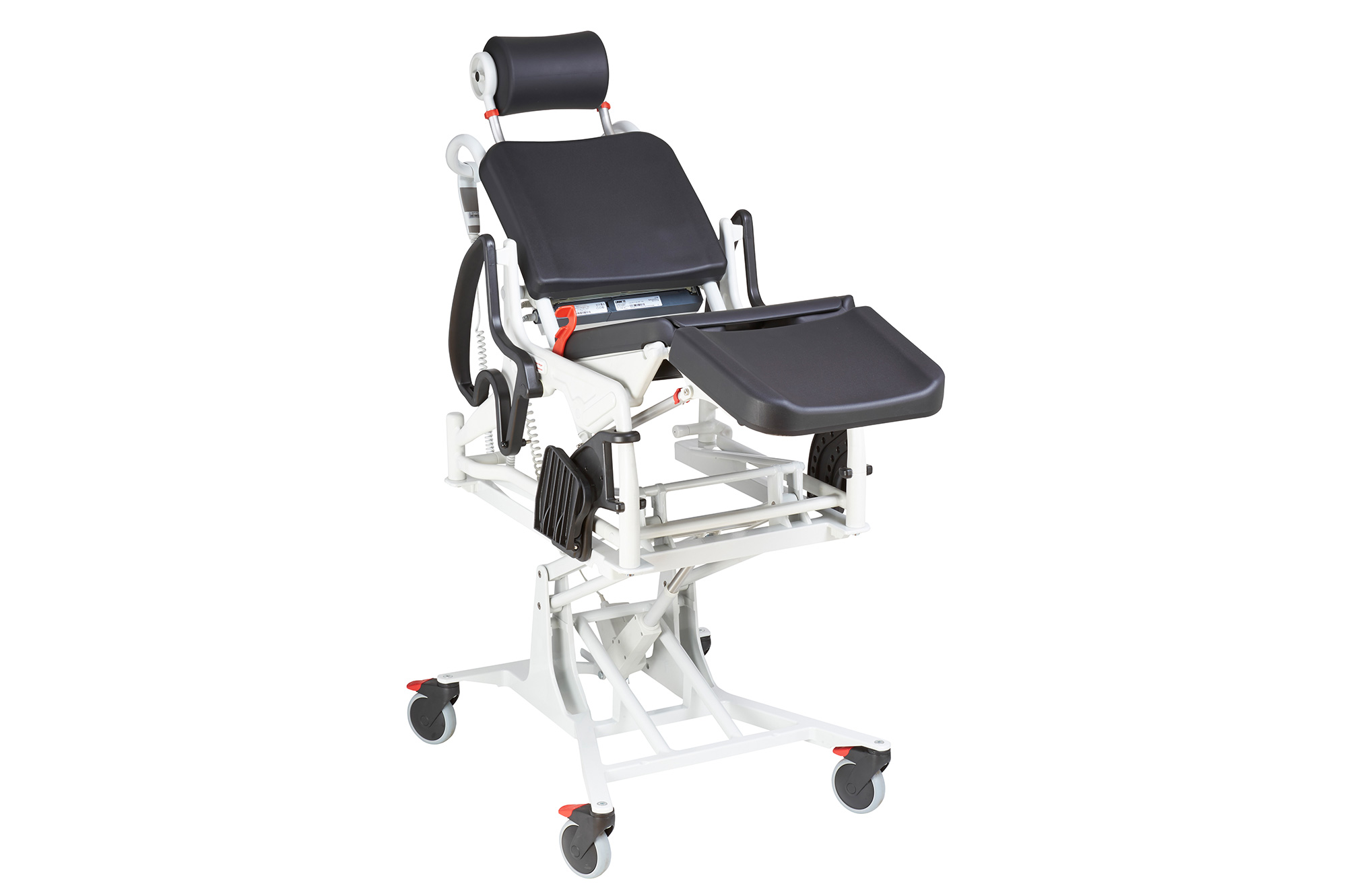 PHOENIX PU ELECTRIC – dušo ir vonios kėdė su elektriniu aukščio reguliavimu, minkšta poliuretano sėdynė su higienine anga. Įrengta reguliuojama galvos atrama, atlošiami porankiai ir pakreipiamas atlošo / sėdynės / kojų atramos judesys.