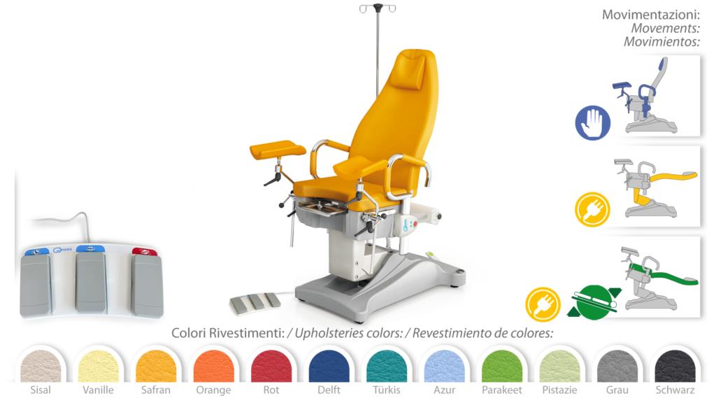 Ši kėdė buvo specialiai sukurta naudoti ambulatorijose ir ligoninėse ginekologijos, echoskopijos, kolposkopijos ir diagnostinių vizitų metu. Reguliavimas atliekamas naudojant mobilią konsolę su 6 pedalais, kuri valdo tris nepriklausomus elektrinius aktuatorius, reguliuojančius kėdės aukštį su centrinia kolona, Trendelenburgo funkciją ir atlošo nuolydį.