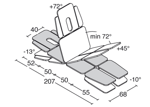 Kušetė turi aštuonias judančias sekcijas. Liemens sekciją galima reguliuoti elektriniu būdu, o kitos sekcijos gali būti reguliuojamos naudojant servo sistemą su viena ar keliomis dujinėmis spyruoklėmis. Dėl varikliu valdomo reguliavimo nereikia operatoriaus pastangų reguliuojant liemens dalį, kol pacientas gydomas.