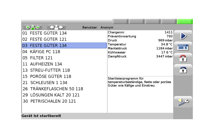 Jis turi daug standartinių funkcijų: maksimalus plotis mažesnis nei vienas metras, pramoninė B&R PLC valdymo sistema, išmanioji HMI su 16:9 spalvotu jutikliniu ekranu, vertikalus durų judėjimas, garu valdomi durų sandarikliai, užtikrinantys optimalų proceso patikimumą, atskiras garo tiekimas į kamerą ir apvalkalą, didelis iš anksto sukonfigūruotų standartinių programų pasirinkimas, spalvota vamzdžių izoliacija, poliruotas kameros paviršius Ra 1,25 µm, LED kameros apšvietimas, mažai triukšmo kelianti ir vandenį taupanti dviejų pakopų vakuumo sistema, pneumatiniu būdu valdomi garo vožtuvai. Visi vamzdžiai, jungiamosios detalės ir vožtuvai, kurie liečiasi su technologiniu garu, gaminami iš nerūdijančio plieno. Taikomi šie standartai: DIN 58951-2 Laboratoriniai garo sterilizatoriai, AD 2000 Slėginių indų projektavimas ir DIN EN 62304 Medicinos prietaisų programinė įranga.