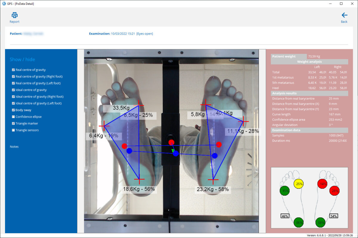 Galima gauti pėdos ir čiurnos laikysenos vaizdus, laikysenos kontrolę ir svorio pasiskirstymą skirtingais momentais ir skirtingomis bandymo sąlygomis. Duomenis galima išsaugoti ir palyginti, o matavimus galima atlikti su pėdos ir čiurnos laikysenos vaizdais.