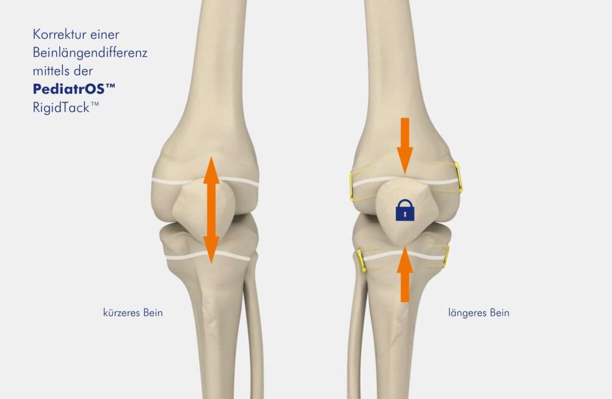 Trapecijos formos „PediatrOS™ RigidTack™“ kabės dizainas yra glaudžiai suderintas su šlaunikaulio ir blauzdikaulio anatomija. Kaniliuotos kojelės leidžia tiksliai įdėti naudojant K vielas. Trumpas fluoroskopijos laikas yra dar vienas privalumas. „PediatrOS™ RigidTack™“ yra vienintelis augimo sustabdymo implantas rinkoje, specialiai sukurtas ir patvirtintas vaikų ir paauglių kojų ilgio skirtumams koreguoti.