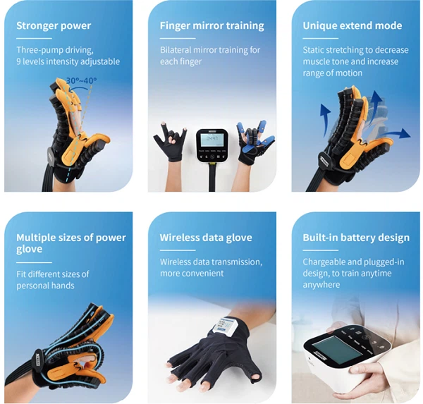 ● Pasyvus treniravimas: Jėgos pirštinė verčia pažeistą ranką atlikti lenkimą ir tiesimą.