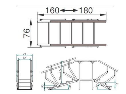 Laiptai: 5 laipteliai, kurių aukštis – 9,5 cm, gylis – 31 cm.