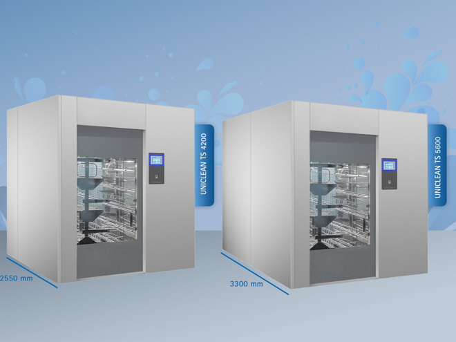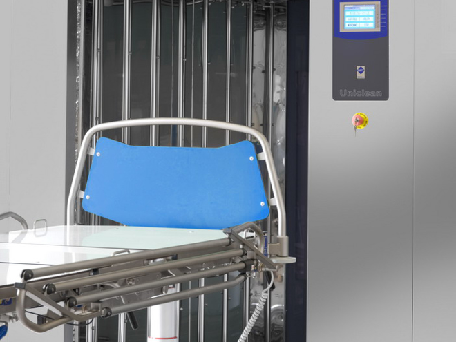 „UNICLEAN SL TS“ – tai pažangus ant grindų kraunamas plovimo ir dezinfekavimo įrenginys, skirtas konteinerių, lovų rėmų, operacinių stalų ir kitos didelių matmenų ligoninės įrangos bei priemonių plovimui ir dezinfekavimui. Kartu su specialiais įkrovimo vežimėliais jis gali būti naudojamas dideliems chirurginės avalynės ir chirurginių instrumentų kiekiams apdoroti. Kad būtų lengva montuoti pas klientą, plovimo mašina galutiniame etape surenkama iš atskirų modulių. Medžiagos įkrovimas į kamerą ir iš jos organizuojamas naudojant įkrovimo ir transportavimo įrangą. Automatinė grindų pakreipimo sistema užtikrina puikų vandens pašalinimą nuo horizontalių paviršių. Įrenginys tiekiamas su vienų ir dviejų durų tarpinėmis versijomis.